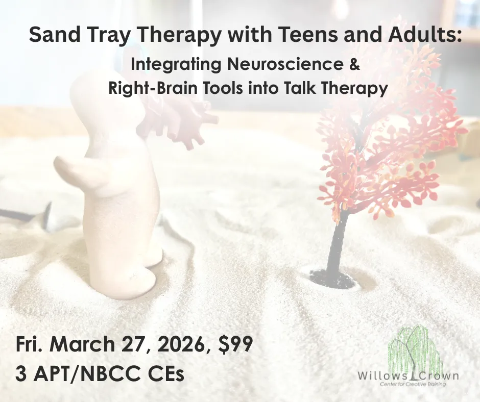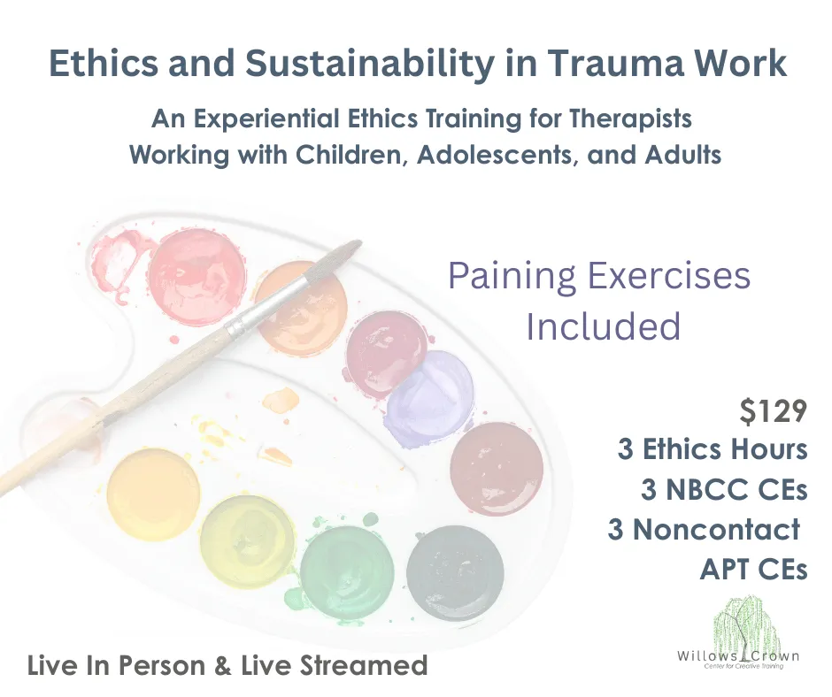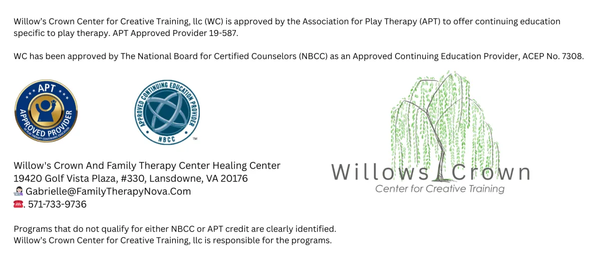 Willow’s Crown Center for Creative Training, llc (WC) is approved by the Association for Play Therapy (APT) to offer continuing education specific to play therapy. APT Approved Provider 19-587. WC has been approved by The National Board for Certified Counselors (NBCC) as an Approved Continuing Education Provider, ACEP No. 7308. Trainings that do not offer continuing education credit from one or both providers is clearly marked. Read each training carefully to see which are applied.